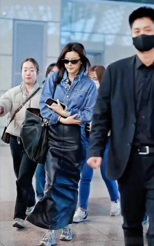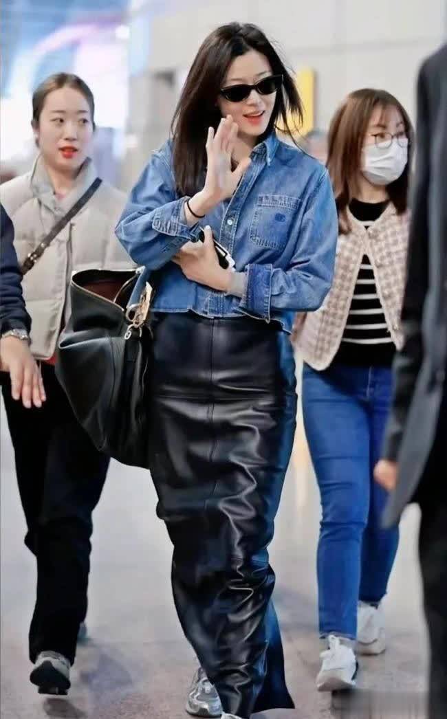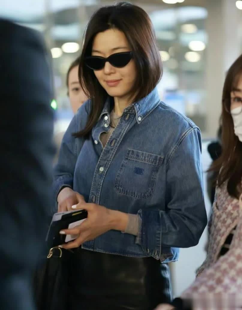 每次看全智贤的私服,都忍不住感叹:她真的太懂“不费力的高级感”了。就像这组机场街拍,一件基础牛仔衬衫配黑色皮裙,没有花里胡哨的设计,却把中年女性的利落与温柔平衡得刚刚好。